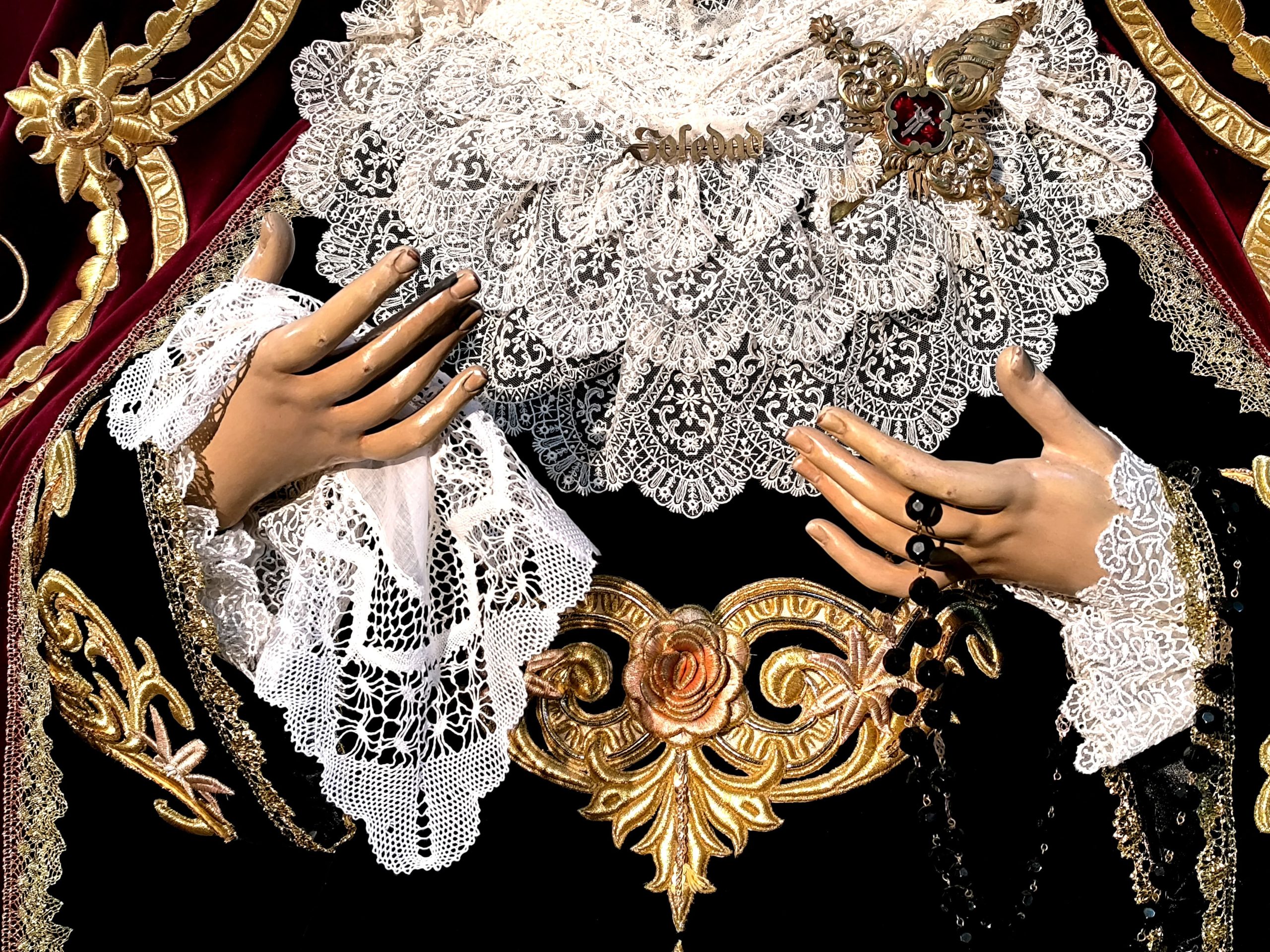Y llega el gran día: el Viernes Santo. Para esta cofradía, el año se mide de Viernes en Viernes Santo. Es el momento de sacar a la Soledad a las calles. La procesión se convierte en un acto íntimo y sobrecogedor, marcado por el paso silencioso de las mantillas, vestidas de riguroso luto. El sonido de los tacones sobre el pavimento se convierte en redoble de tambor. Todo queda en silencio, solo interrumpido por el grito del alma: la saeta que cruza el aire, el canto de dolor y fe que Alcázar ofrece a su Virgen.